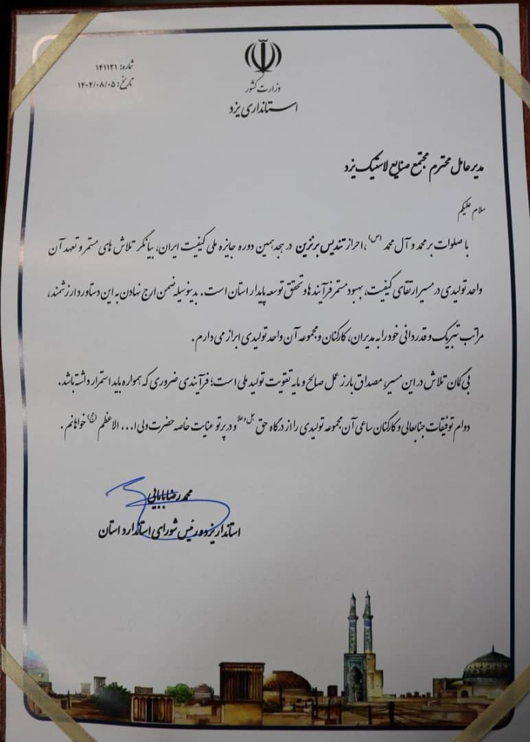 این تقدیر به پاس تولید باکیفیت، تلاش در بهبود فرایندهای صنعتی، و نقش مؤثر در توسعه اشتغال و تولید استان یزد از سوی استاندار محترم به ایشان اهدا گردید.