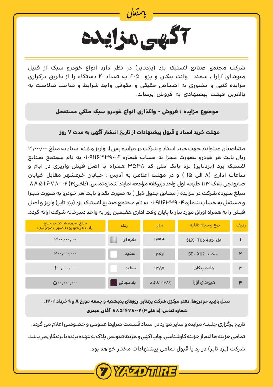 آگهی مزایده خودرو - تاریخ انتشار: 1404/03/06